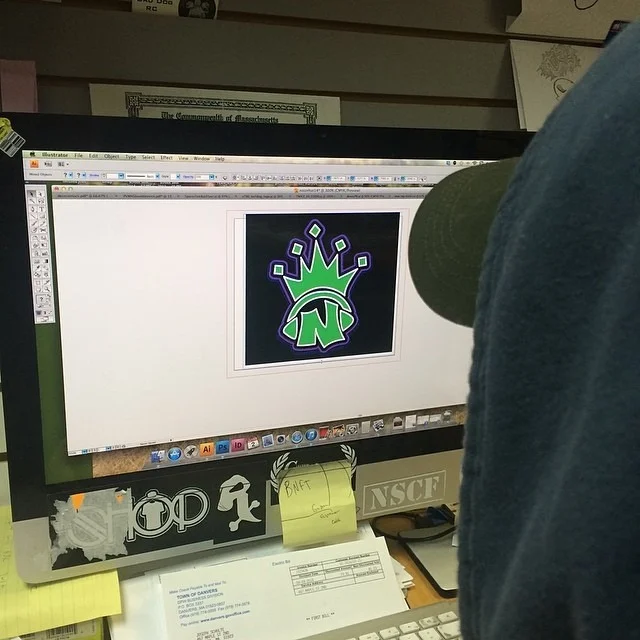 April 2, 2014 Brian Kapust @joe_benfrank setting up our “Note” logo to be digitized for some new snap backs! #dope #fresh #snapback #noize #clothing